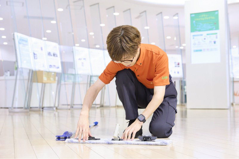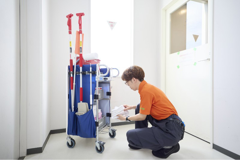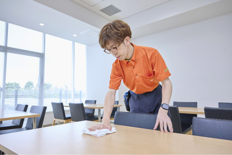 ロビー・トイレ・食堂・会議室などの清掃を主に担当しています。汚れていた場所がキレイになると、気持ちが良いですし、清掃中や清掃が終わった後などに親会社の従業員の皆様の「いつもありがとう」、「キレイになったね」の一声が自分自身の励みになりますし、やりがいを感じます。